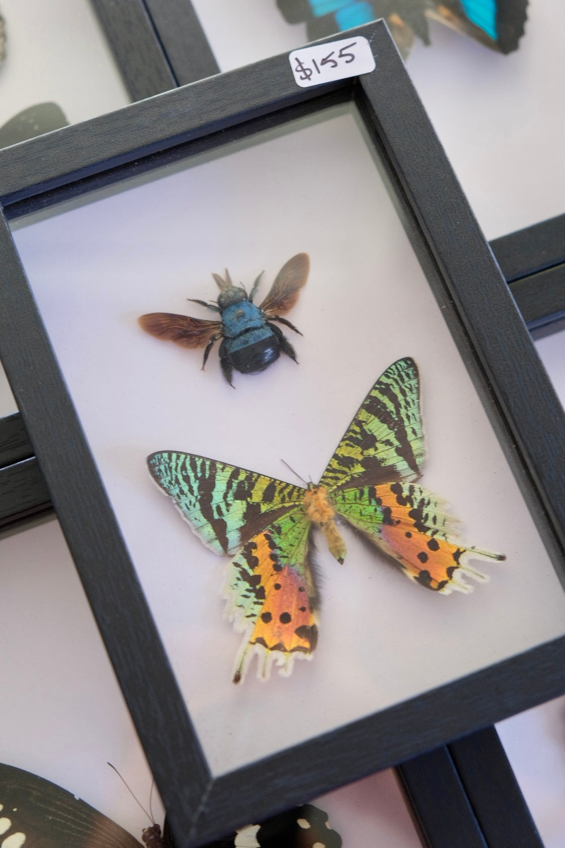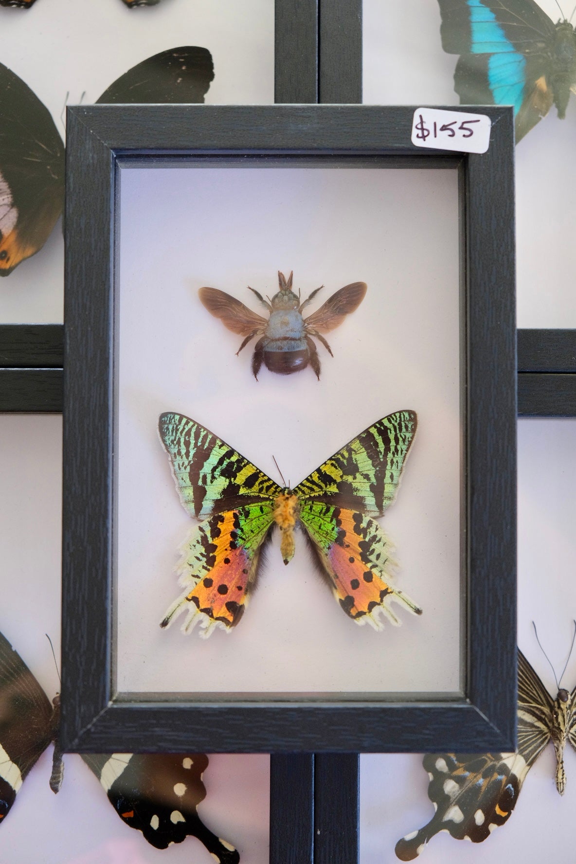 A stunning Madagascan sunset moth & blue carpenter bee mounted together in a shadow frame.