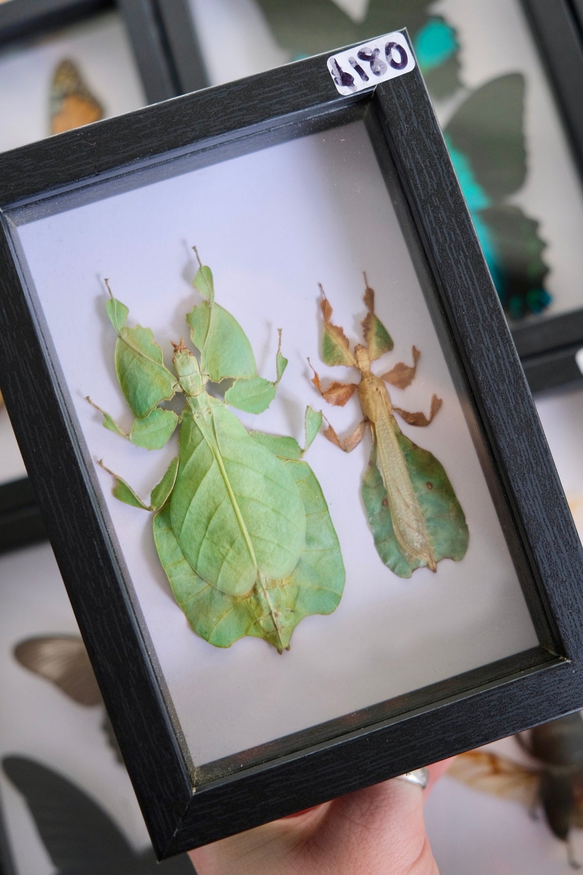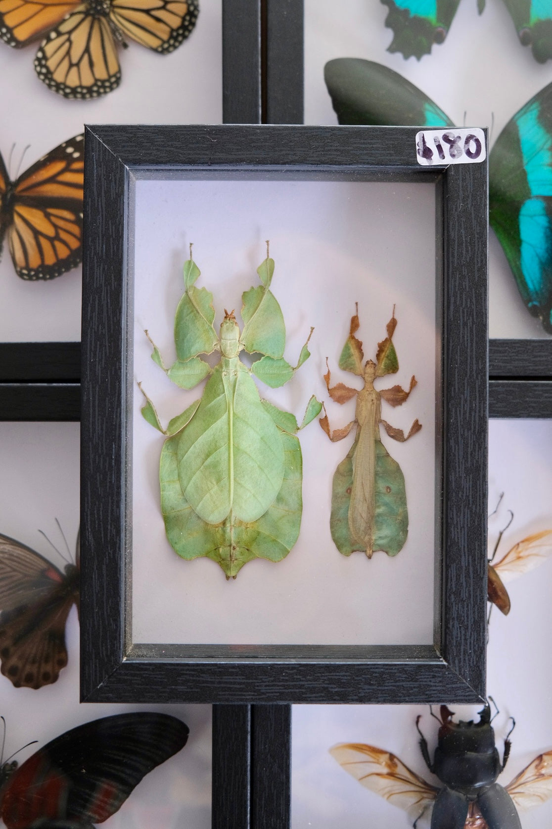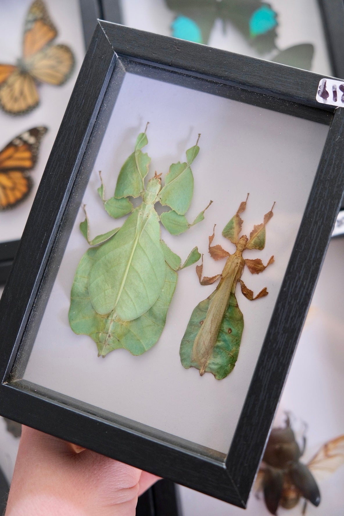 Two stunning leaf insects mounted together in a shadow frame.