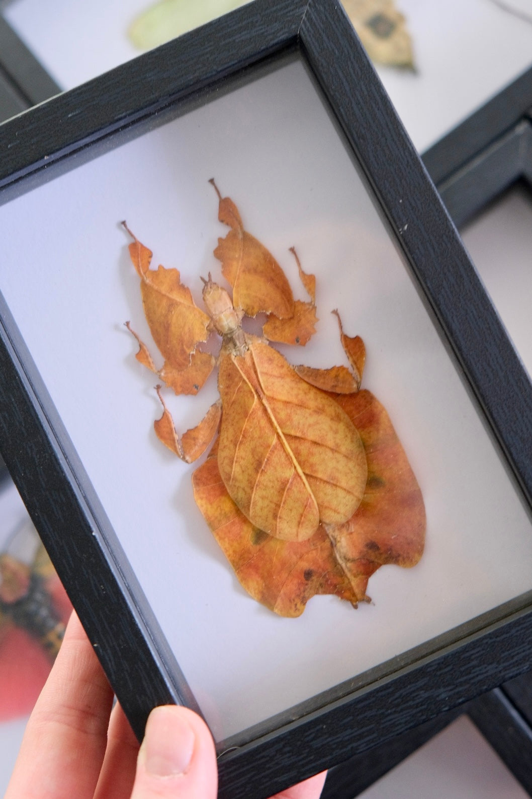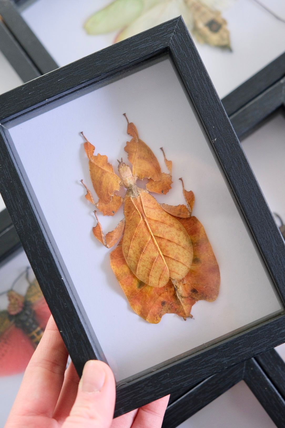 This leaf insect has been mounted onto a white background in a shadow frame.
