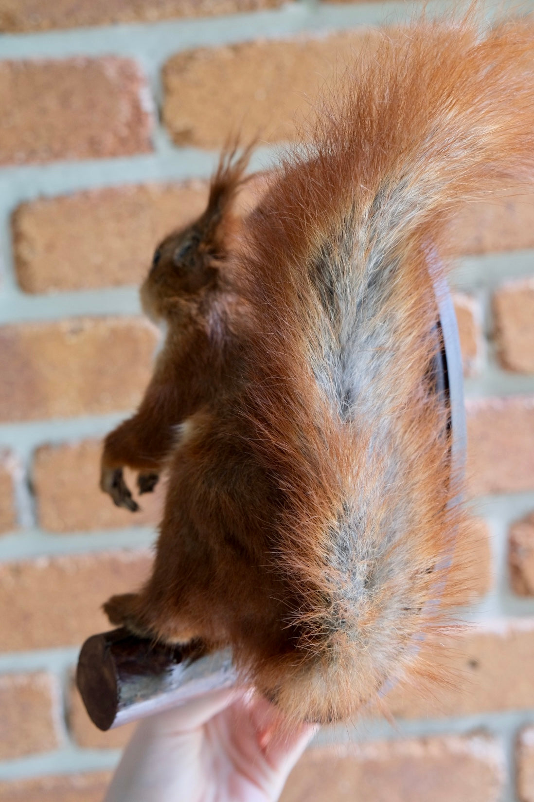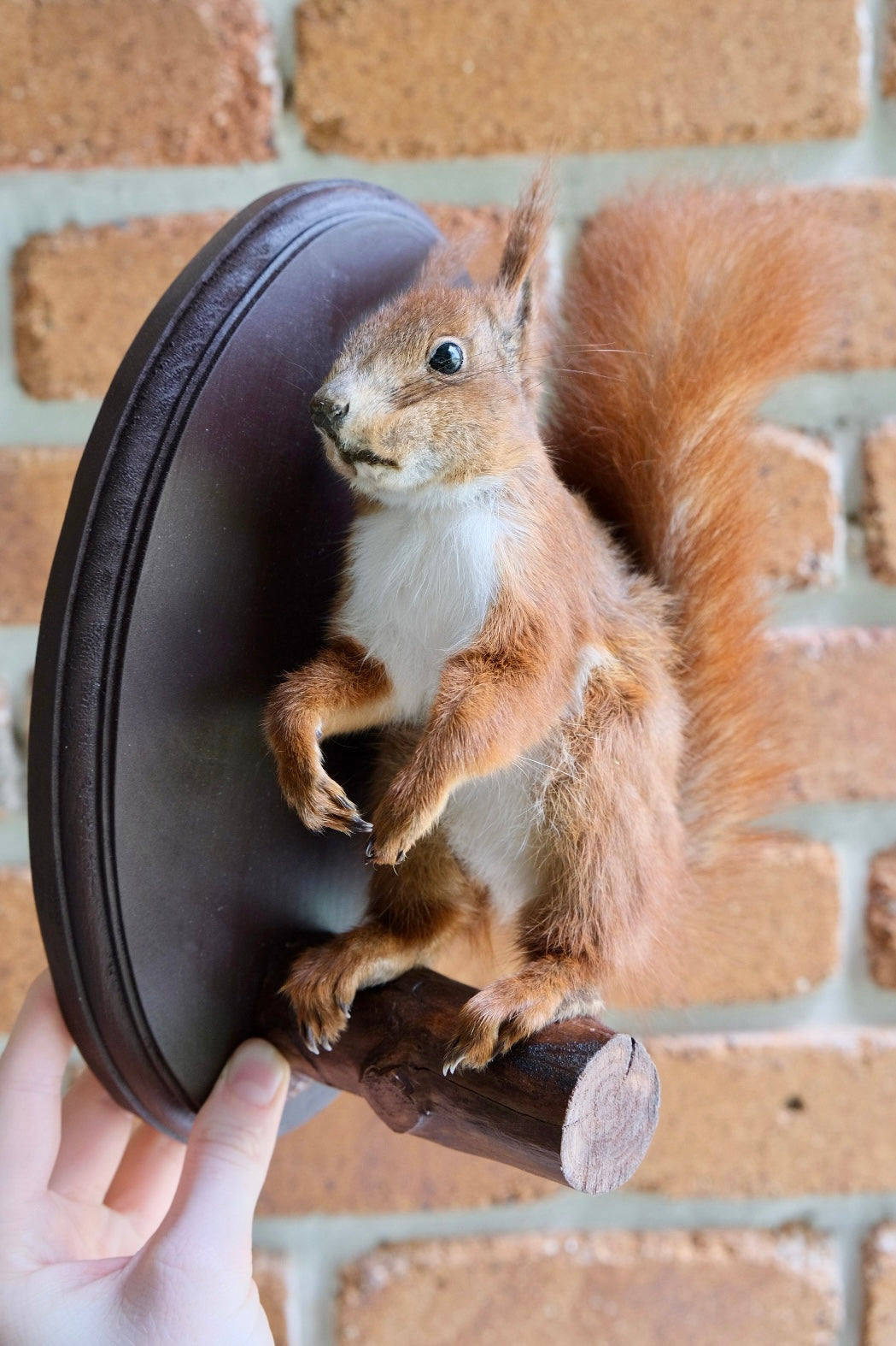 A taxidermy squirrel named King. He can be hung onto the wall via the hook on the back of his base.