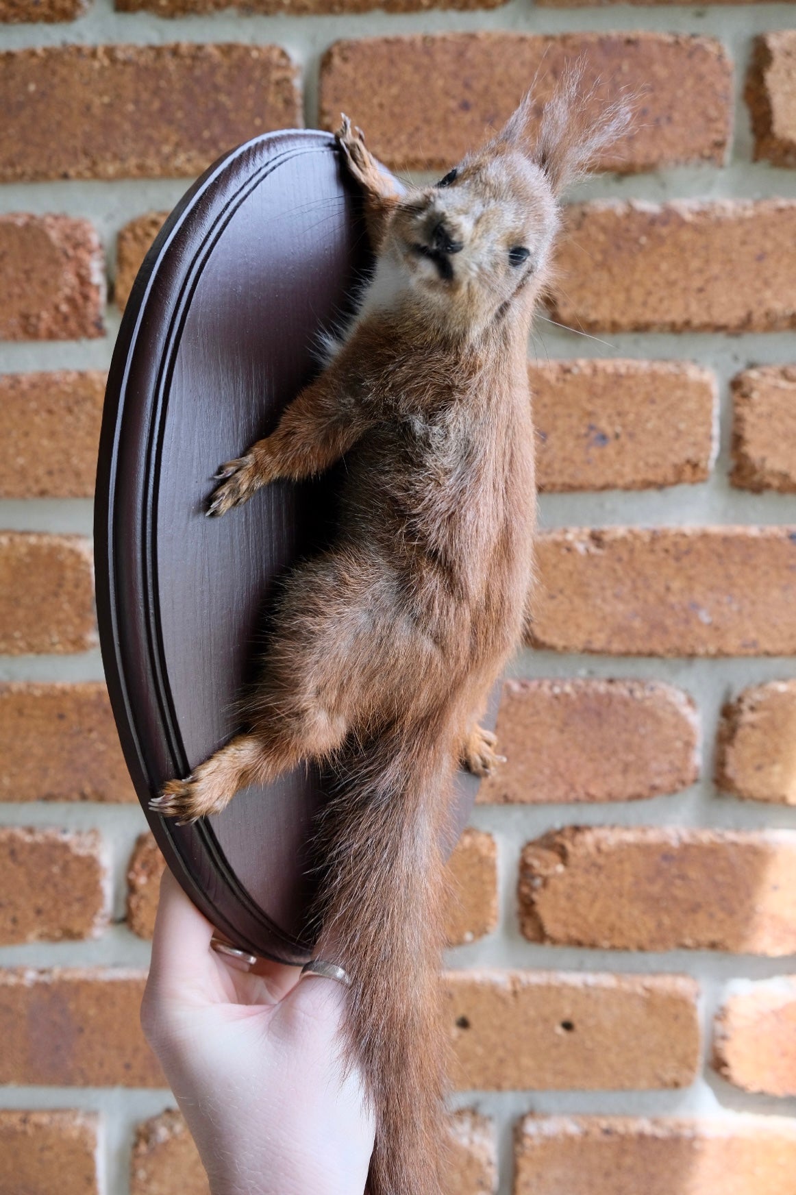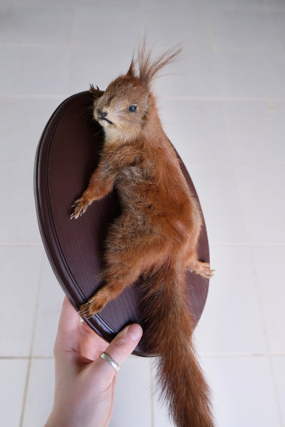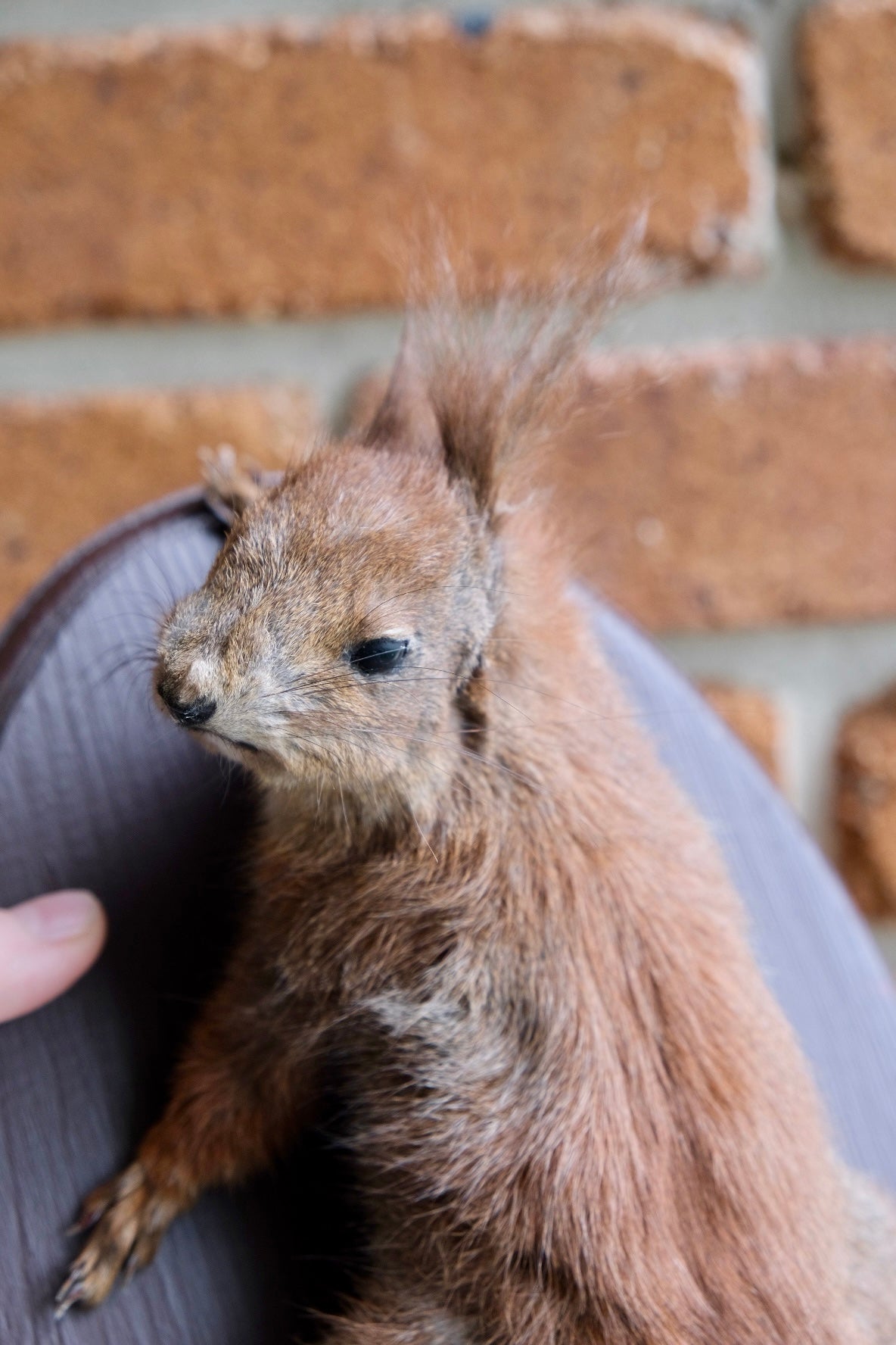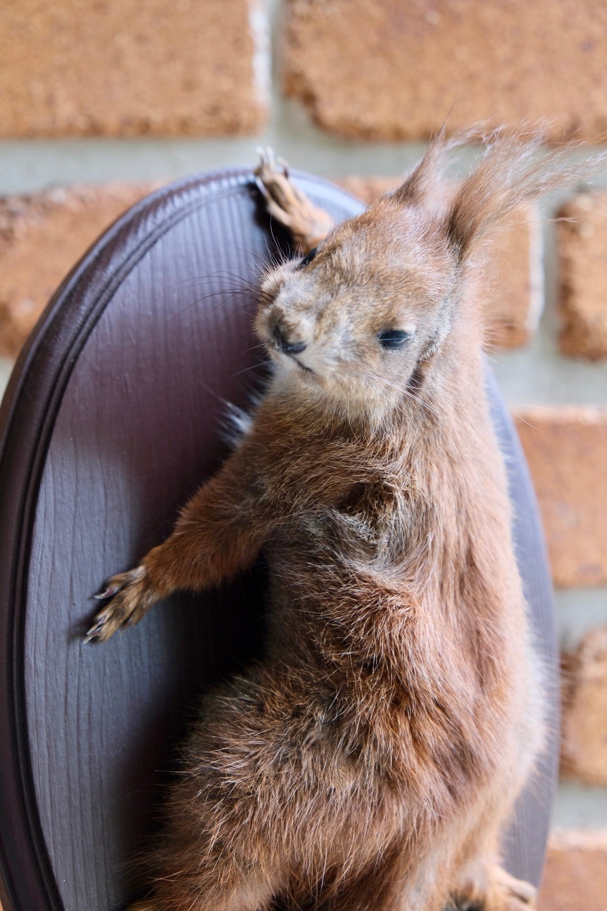 A taxidermy squirrel named Joey. He can be hung onto the wall via the hook on the back of his base.